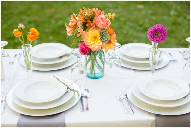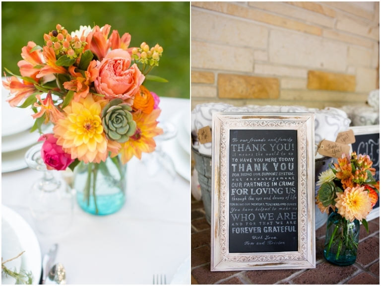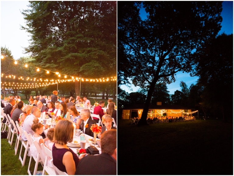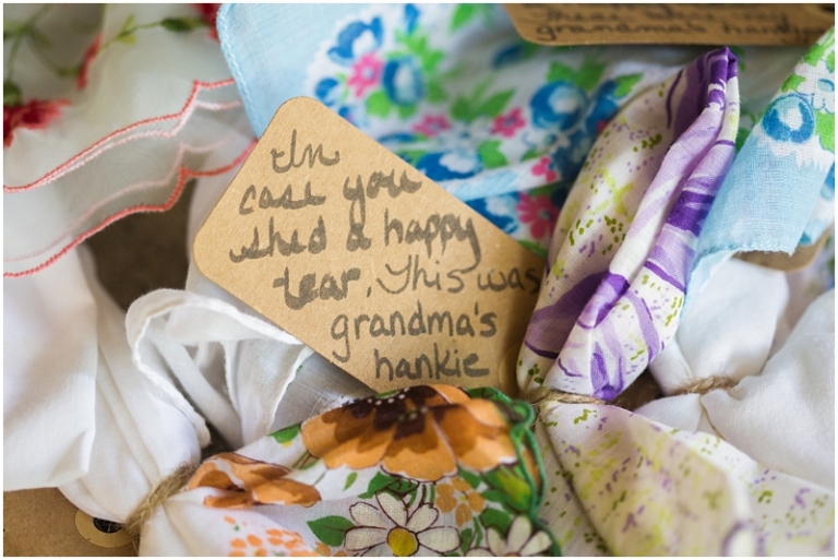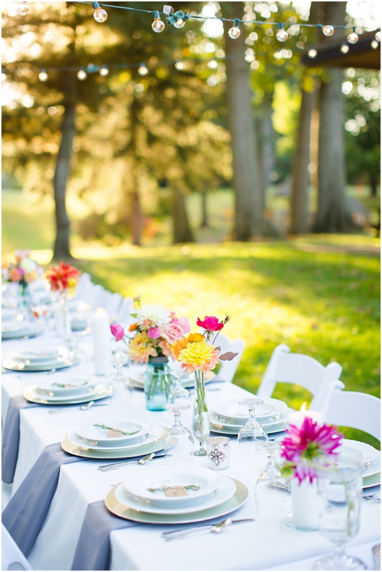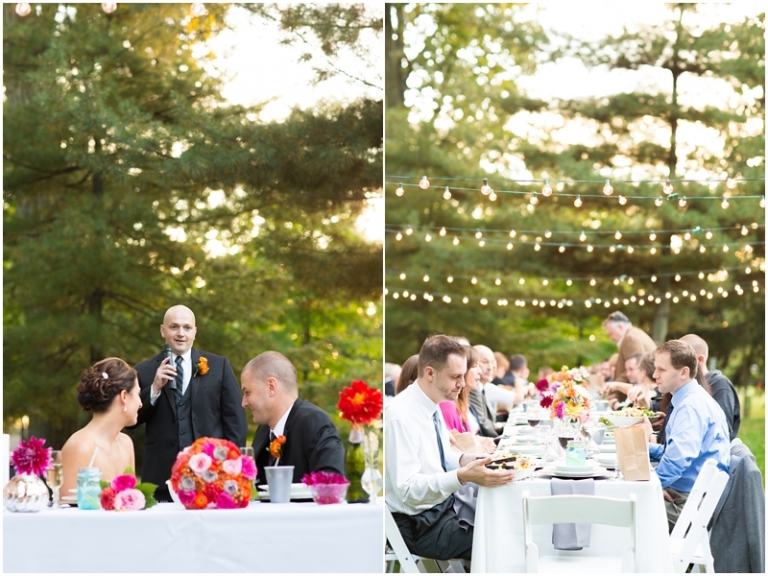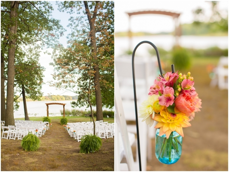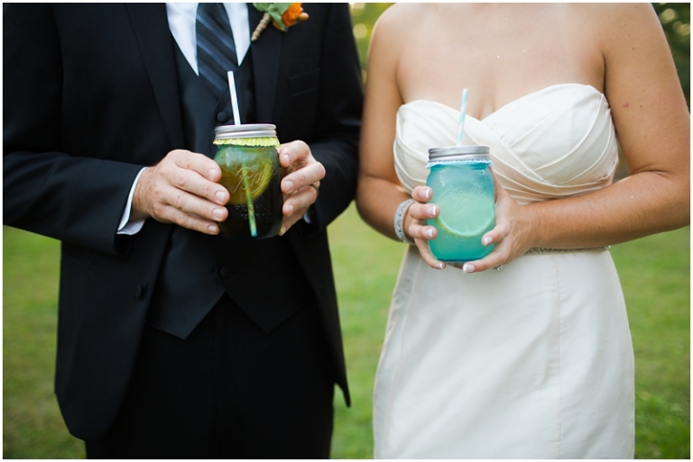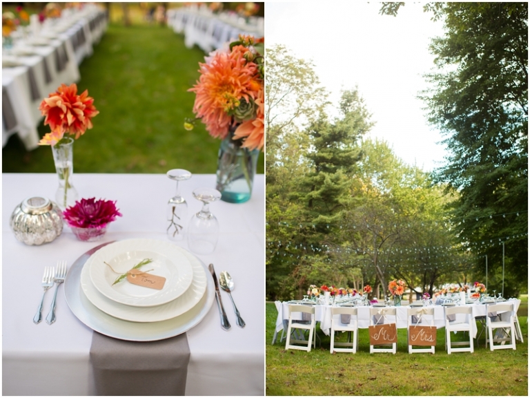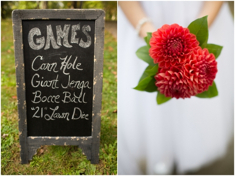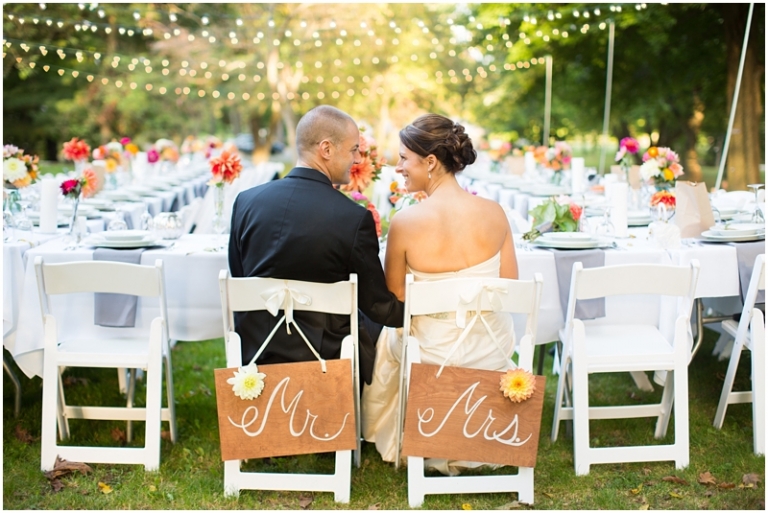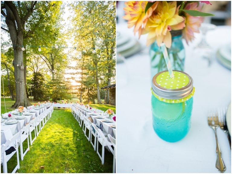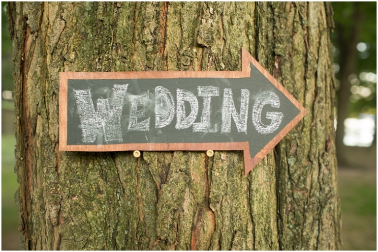 This beautiful bride turned what would normally be a simple picnic area at a Ohio state park site outside of Akron Ohio into one of the most beautiful & charming outdoor weddings with many personal touches! The Brides loves dahlias and grew her own to use in the arrangements. Blue glass mason jars were used for drinking and as centerpieces (she also loves to can ). They designed a logo that is used on the invitations and as the guest book. They made the arbor they got married under and it will later be place on the five acres that they just bought. She hand lettered all the chalk board signs. – she also placed one of her grandmothers handkerchiefs on the seat of family members